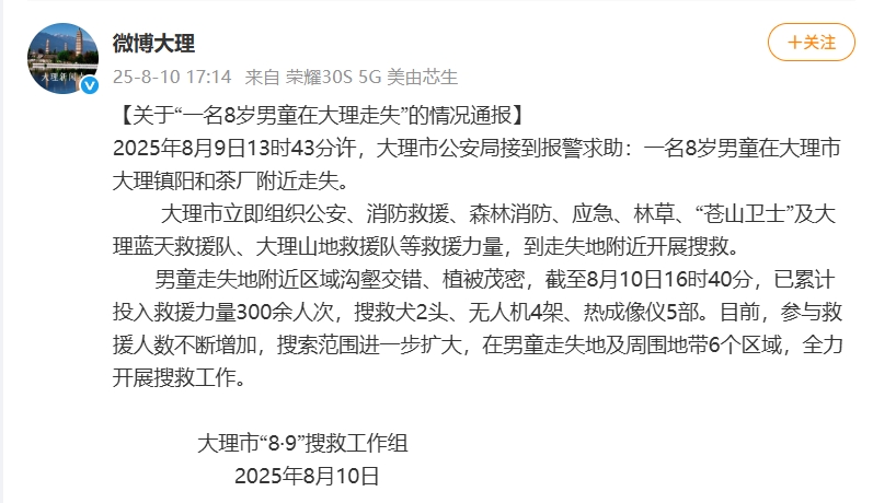 | 中国新媒体通讯社8月10日电 据大理市委宣传部官方微博消息,云南大理市“8·9”搜救工作组发布通报称,2025年8月9日13时43分许,大理市公安局接到报警求助:一名8岁男童在大理市大理镇阳和茶厂附近走失。 大理市立即组织公安、消防救援、森林消防、应急、林草、“苍山卫士”及大理蓝天救援队、大理山地救援队等救援力量,到走失地附近开展搜救。 男童走失地附近区域沟壑交错、植被茂密,截至8月10日16时40分,已累计投入救援力量300余人次,搜救犬2头、无人机4架、热成像仪5部。目前,参与救援人数不断增加,搜索范围进一步扩大,在男童走失地及周围地带6个区域,全力开展搜救工作。 图片来源:大理市委宣传部官方微博截图 微信扫一扫,阅读更方便^_^ |