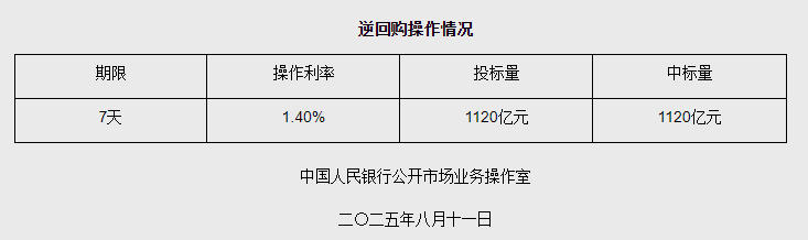 (香港)中国新媒体通讯社8月11日电 据央行网站消息,2025年8月11日中国人民银行以固定利率、数量招标方式开展了1120亿元逆回购操作。具体情况如下: