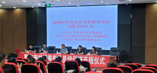 (开班仪式现场) 8月5日上午,贵州省黔东南州营养指导员培训开班仪式在黔东南州公共培训基地举行,黔东南州卫生健康局领导贺湘友,贵州医科大学第二附属医院党委副书记徐勇,临床营养科主任杜贤仕,黔东南州营养协会会长罗芳出席开班仪式。
