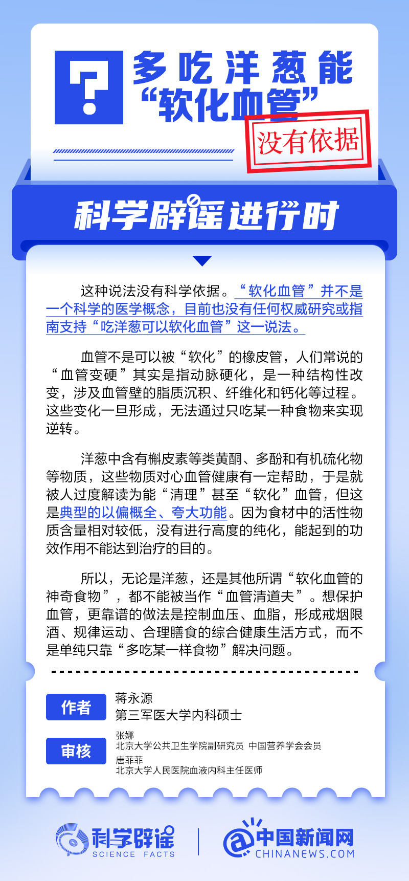 | 中国新媒体通讯社5月27日电 “软化血管”并不是一个科学的医学概念,目前也没有任何权威研究或指南支持“吃洋葱可以软化血管”这一说法。人们常说的“血管变硬”其实是指动脉硬化,这是一种结构性改变,涉及血管壁的脂质沉积、纤维化和钙化等过程。这些变化一旦形成,无法通过只吃某一种食物来实现逆转。