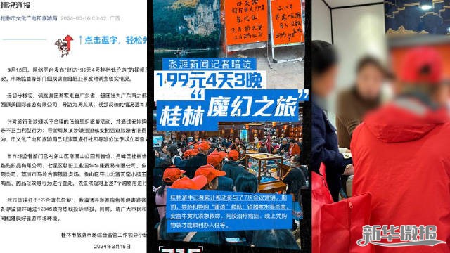 | 3月16日,广西桂林市旅游市场综合监管工作领导小组办公室发布通报称,3月15日,网络平台发布“暗访199元4天桂林低价游”的视频引发关注。桂林市立即由文旅、公安、市场监管等部门组成调查组赶赴事发地调查核实情况。 经初步核实,该旅游团游客来自广东省,组团社为广东南之都国际旅行社有限公司,地接社为广西原美国际旅游有限公司,导游为周某某,视频反映的情况基本属实。 针对旅行社涉嫌以不合理的低价组织旅游活动,并通过安排购物或者另行付费旅游项目获取回扣等不正当利益行为;导游周某某涉嫌强迫或变相强迫旅游者消费,向旅游者兜售物品的违法违规行为,桂林市文化广电和旅游局已对涉事旅行社和导游依法予以立案查处。 桂林市市场监管部门已对象山区南溪山公园科普馆、秀峰区桂林怡心堂中药有限公司、七星区锦绣丝路纺织品有限公司、七星区朝阳工业园年年康贸易有限公司、象山区德天生活广场广西亚太皮革有限公司、荔浦市马岭古寨银器卖场、象山区平山北路瓦窑小镇玉器经营者蒋某等涉嫌虚假夸大宣传商品、药品功效等行为进行查处,依法依规对上述7个购物店进行停业整顿,立案调查。 桂林市坚决打击“不合理低价游”、欺骗诱导游客购物等侵害游客权益及扰乱市场秩序的行为,欢迎社会各界监督并通过12345政府热线投诉举报。同时,请广大市民和游客自觉抵制“不合理低价游”,共同构建良好旅游市场环境。 微信扫一扫,阅读更方便^_^ |