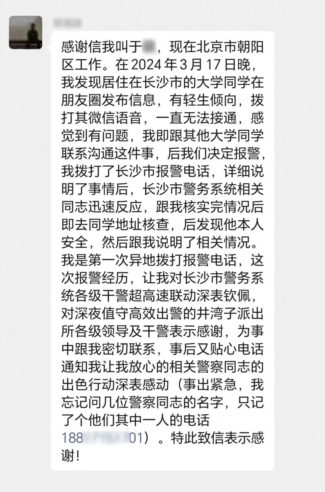 | “我是第一次异地拨打报警电话,这次报警经历,让我对长沙市警务系统各级干警超高速联动深表钦佩……”3月19日,一位家住北京的于先生在“长沙警事”公众号评论区写了一封感谢信点赞长沙公安。事情还要从3月17日开始说起。 3月17日晚,于先生发现他住在长沙的大学同学小峰(化名)发了一条朋友圈,情绪比较悲观,言语间透露出轻生倾向。刚开始,于先生觉得对方可能是在闹着玩。“我马上给他打了电话过去,但一直没人接。”于先生预感不对劲,又让另外一名同学联系小峰,结果依然无人接听。 从另一名同学那里拿到小峰在长沙的住址后,于先生马上报了警。“我打了110之后,这边说无法转接到异地,但是可以加区号。”他回忆,异地报警后,长沙警方简短地询问了核心问题,说:“我们一定会立马安排处理。” 18日凌晨1时许,长沙市公安局110指挥中心接到了于先生的报警,随后立即将警情转至雨花公安分局井湾子派出所,接警的是民警王璐。“报警人说他同学应该是住在红星商务楼的其中一个房间,但也有可能不是。”不一会儿,王璐与同事就来到了红星商务楼。 当时有一个保安在值班。“我们在保安的帮忙下,逐一去敲门,最终找到了小峰。”王璐说,一进门,他发现小峰和妻子坐着,情绪低落。随后,王璐对小峰进行了开导:“你发了一个朋友圈,好多朋友都非常关心你,他们都在外地,比较关心你的状况,所以我们上门核实一下。” 在交谈中,王璐了解到,小峰患有抑郁症,这段时间碰到了一些困难,压力比较大。于是,王璐又说:“困难只是暂时的,我们大家可以一起解决,还是要勇敢地面对生活。”见小峰最终放弃轻生念头,王璐与同事才放心离开。王璐给于先生回了个电话,说小峰已经放弃轻生念头,请他放心。 于先生想再次通过媒体平台表达对长沙警务系统的感谢。“我是隔着这么远异地报警,首先要感谢他们特别相信我,然后要感谢他们出警特别迅速。”于先生说。 微信扫一扫,阅读更方便^_^ |